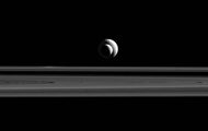 Тефия и Энцелад визуально разместились над кольцами вблизи друг от друга, став почти в линию перед объективом камеры.
